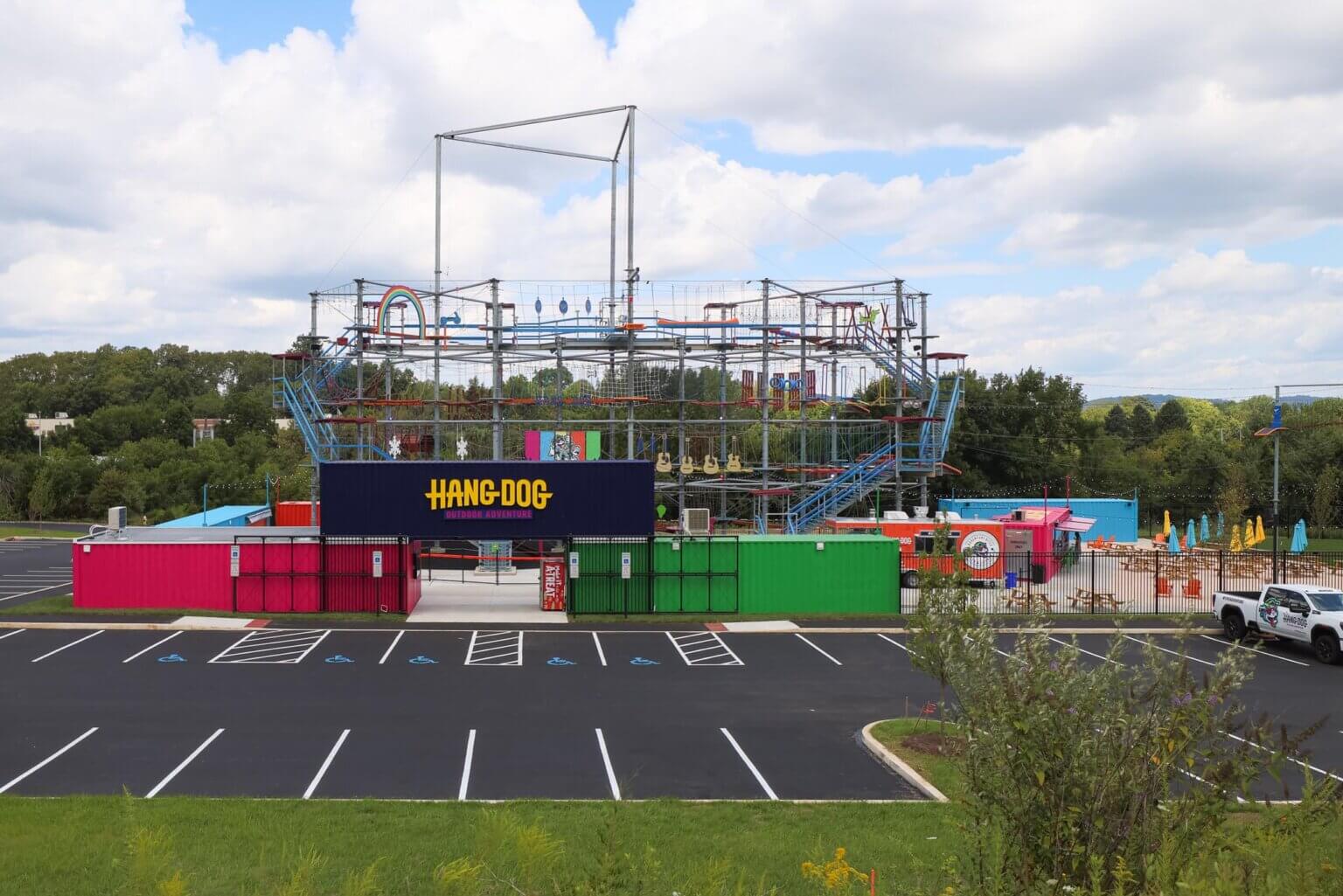 HangDog Outdoor Adventure is the largest outdoor adventure course in the Northeast, featuring eight recycled shipping containers for harness staging, retail, restrooms, and a bar that hosts HangDog Brewing Co. Conceived by the owners of Lehigh Valley Grand Prix, its signature color palette was inspired by a dog collar. A strategic site plan creates distinct zones, maximizing every inch of space.