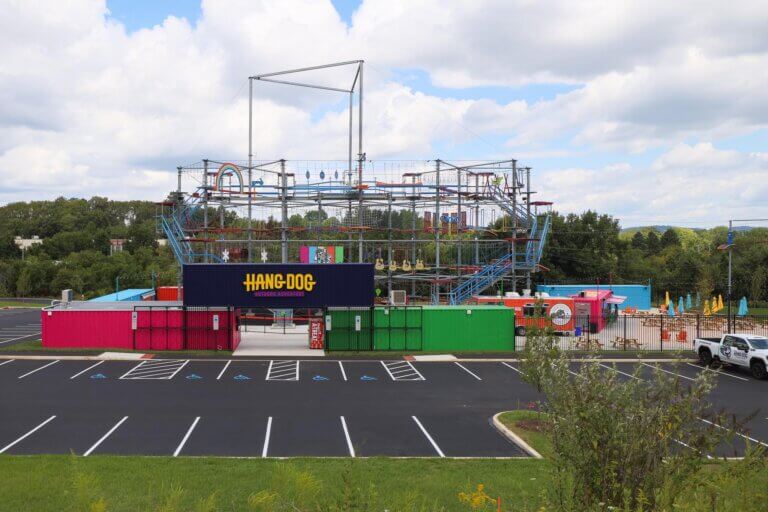 HangDog Outdoor Adventure is the largest outdoor adventure course in the Northeast. The campus is compiled of 8 recycled shipping containers including a harness staging container, retail container, restroom, and bar container – home to HangDog Brewing Co. The facility offers an entertainment venue for live music, and a beer garden that welcomes leashed dogs.