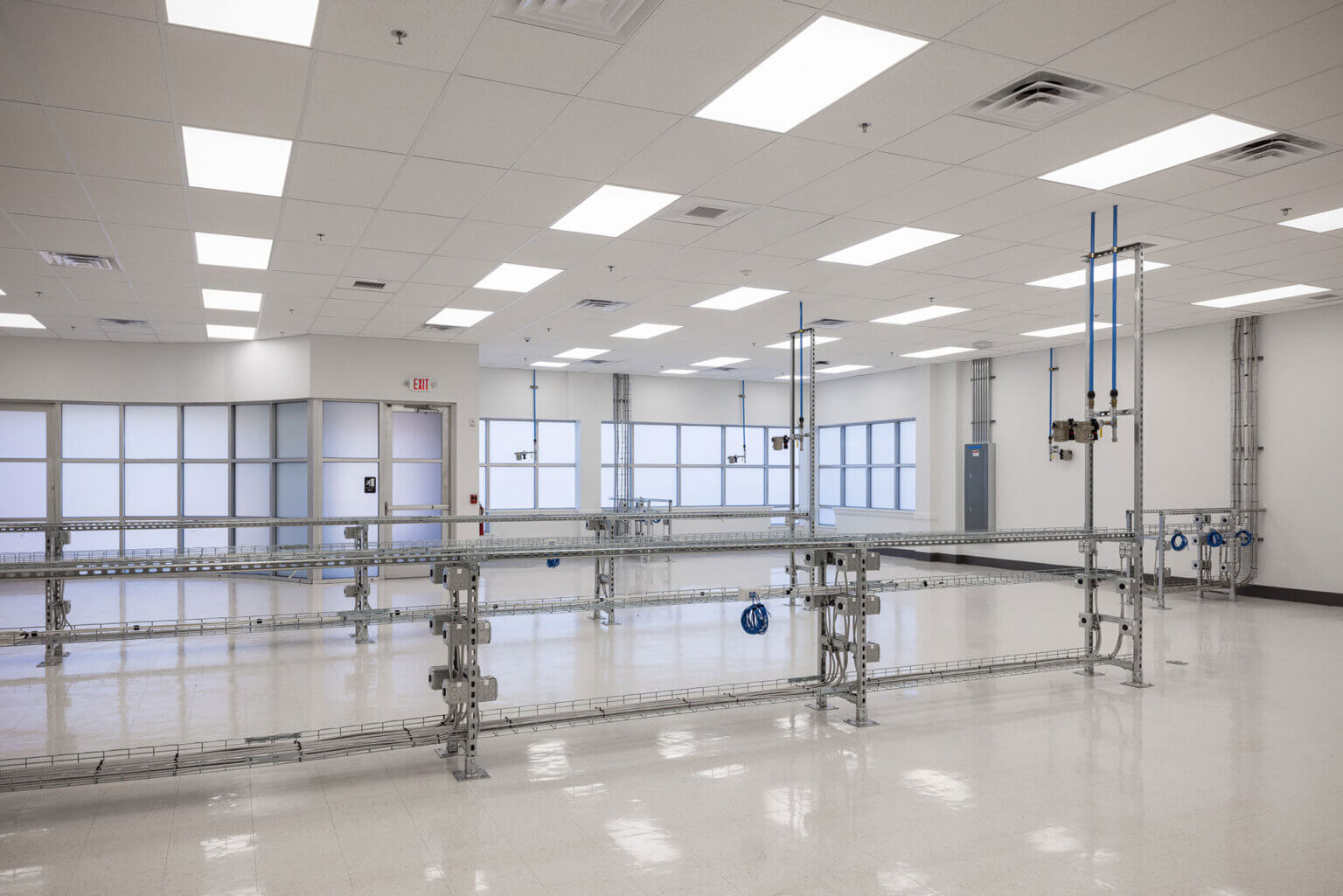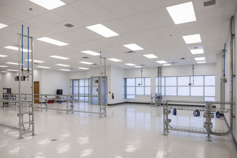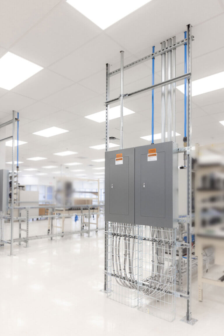 The core of the project was renovating a specialized testing and production Work Area. SAGE replaced the existing ceiling to achieve the required height for equipment, and coordinated all above ceiling infrastructure to support new operational demands. A custom unistrut half wall system was engineered to organize and carry electrical, low voltage, data, compressed air, nitrogen, and snorkel exhaust utilities. This solution provides clean distribution pathways, improved technician access, and long-term adaptability as equipment needs evolve. Furthermore, SAGE worked with the Infinera–Nokia team to design and install the appropriate humidification system and DI water system necessary for the space. These integrated systems collectively ensure the Work Area meets the environmental stability and reliability required for Infinera–Nokia’s advanced operations.