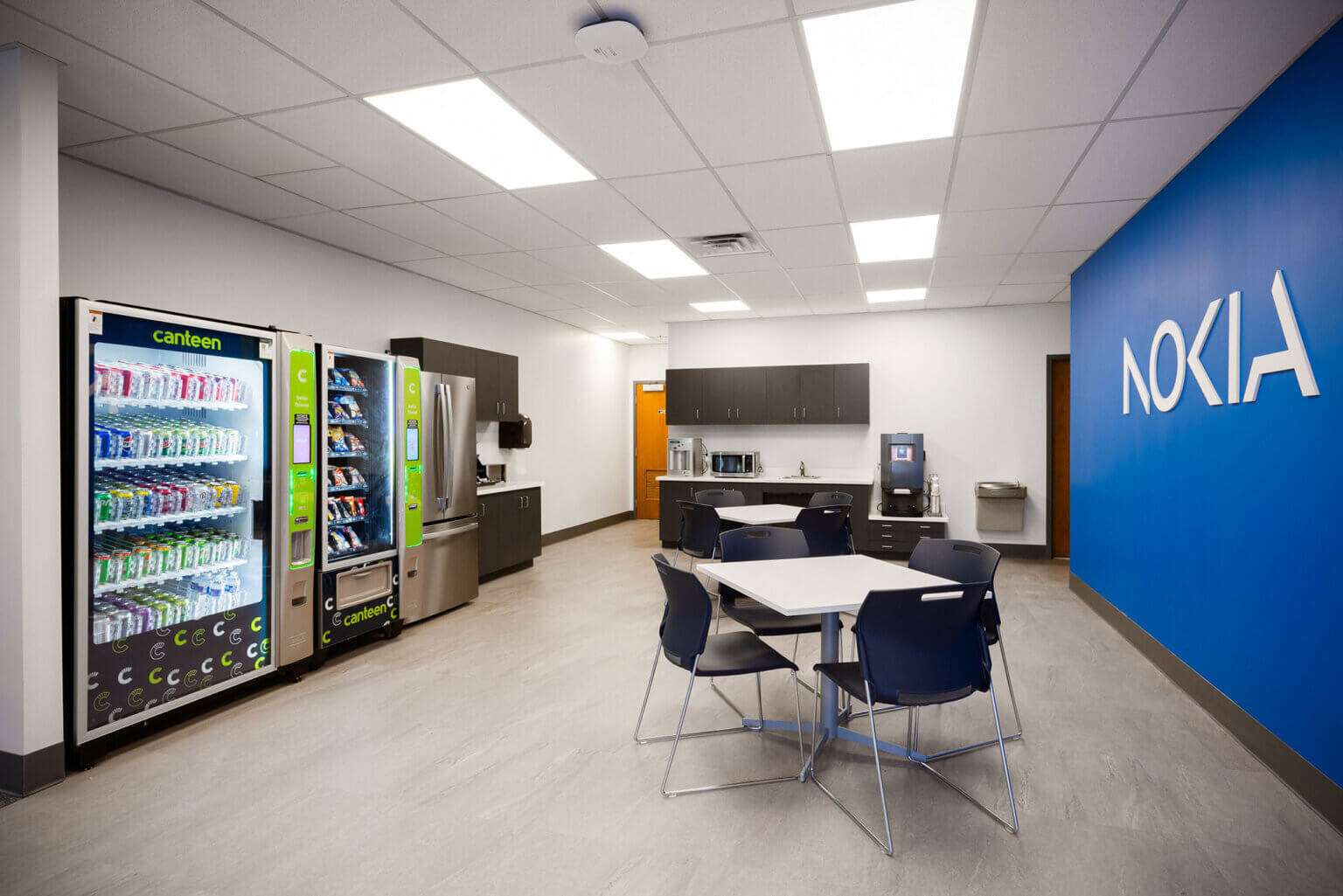 To establish a modern environment, SAGE refreshed interior finishes across the office support spaces, including reception, shared offices, conference rooms, and the staff lounge. Material and finish selections were developed in close collaboration with Nokia’s national design team to maintain brand alignment. SAGE also worked closely with Infinera’s preferred local furniture vendor to select and procure all furniture for the space.