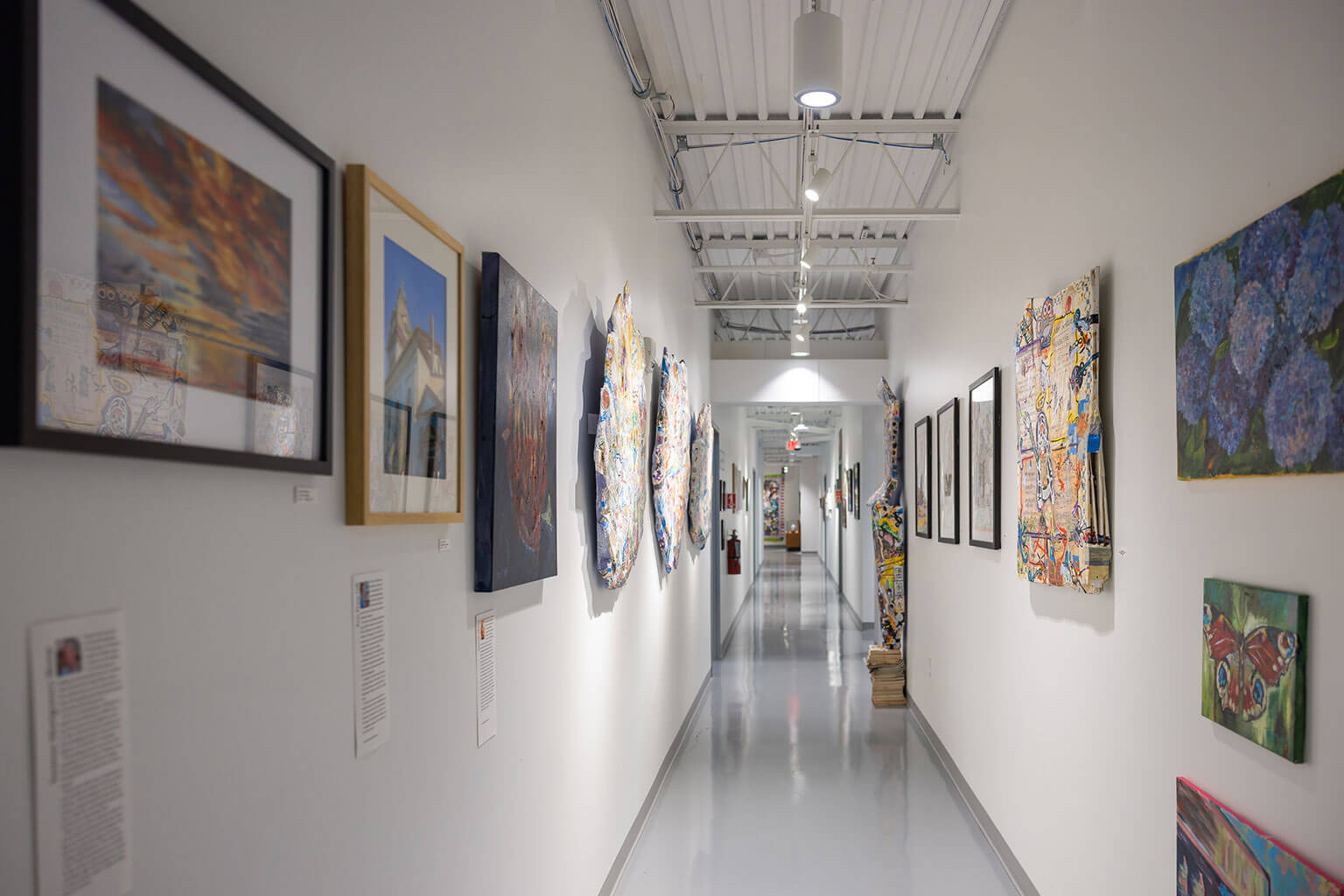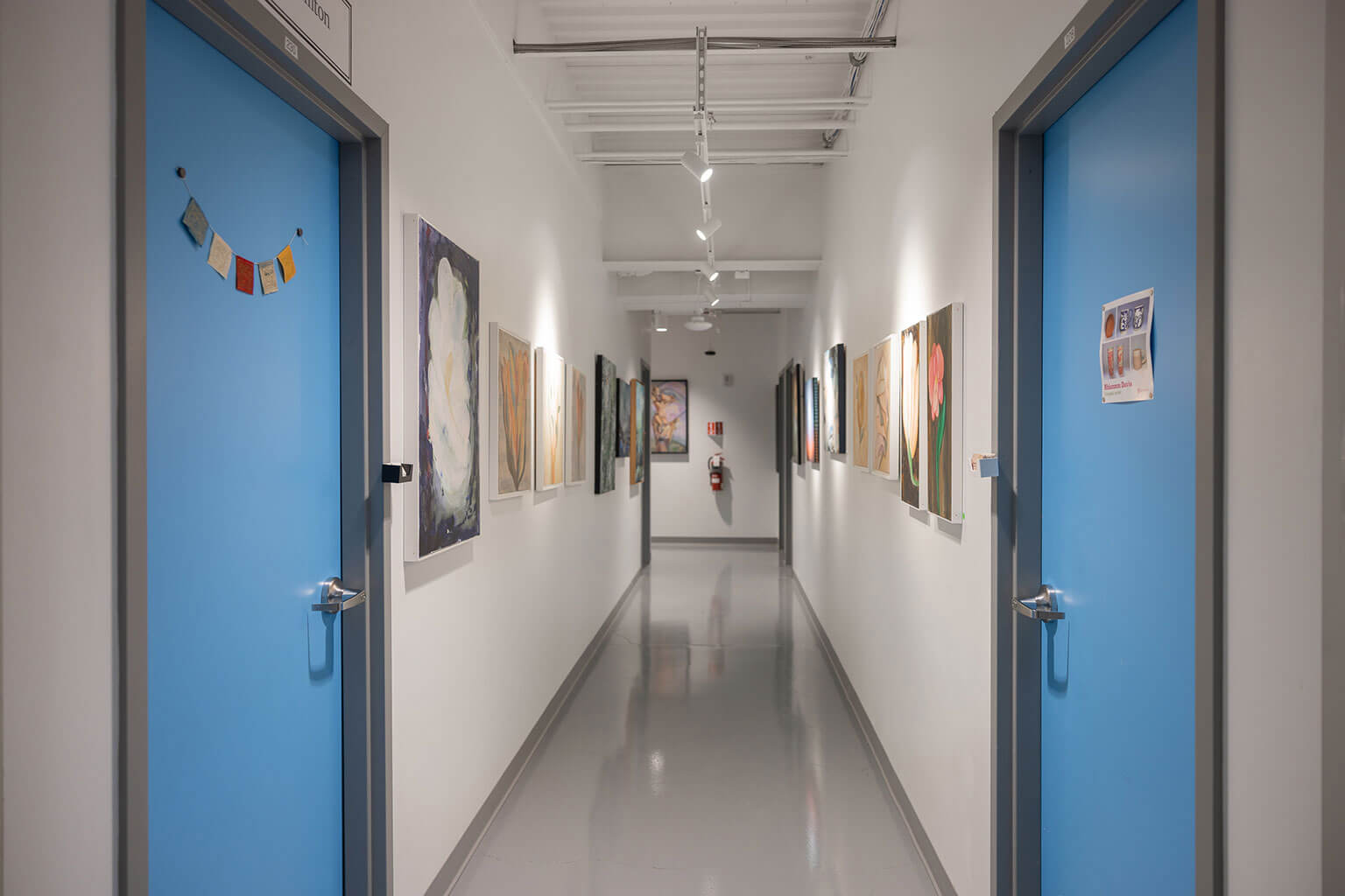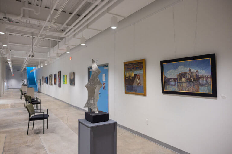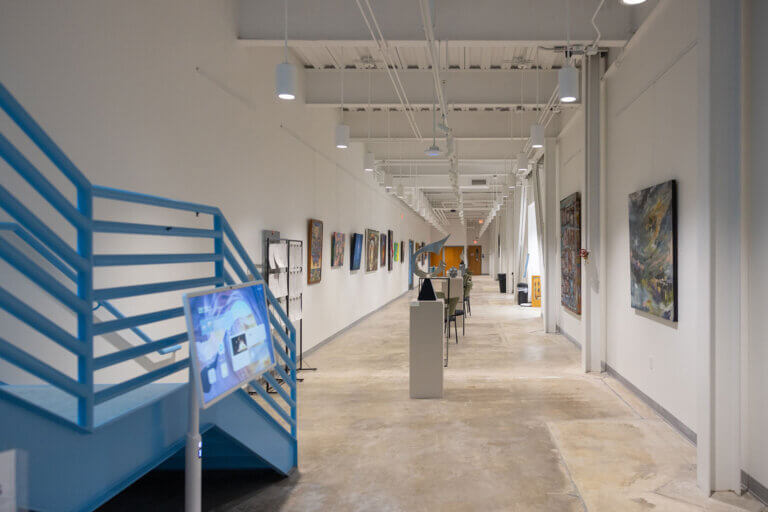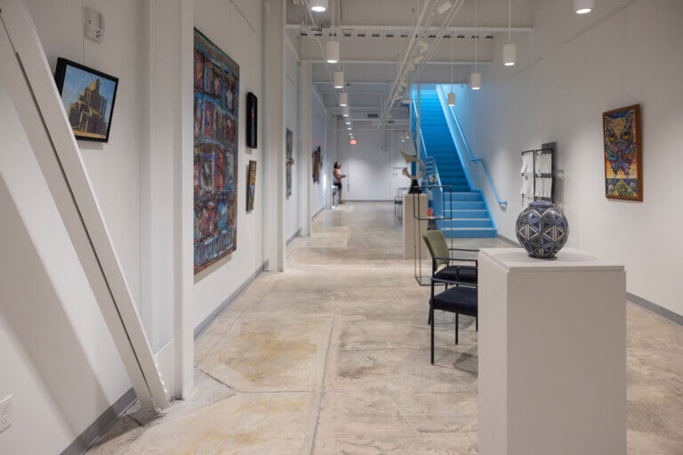 From a design aspect, the existing space certainly held its challenges. The building sits over a culvert which required investigation for locating new under-slab utilities and the elevator shaft. From the second-floor story space was very shallow from the floor to the bottom of the structure which posed some challenges with ceiling heights. Ultimately it was decided to expose some of the structure throughout studios along the exterior wall, the corridors, and the main gallery space. The second-floor studios located internally in the building, have a ceiling in which the design team needed to adjust ductwork dimensions in order to achieve the highest ceiling possible.
