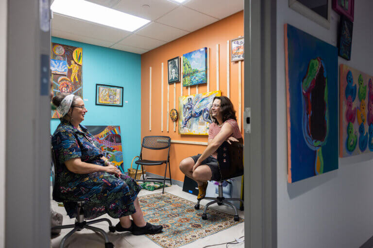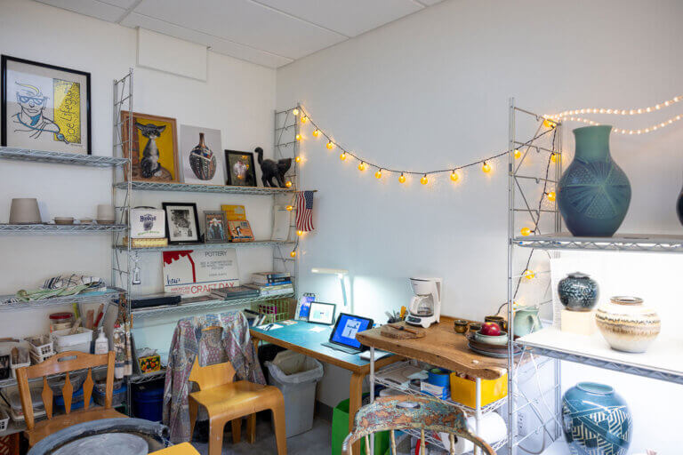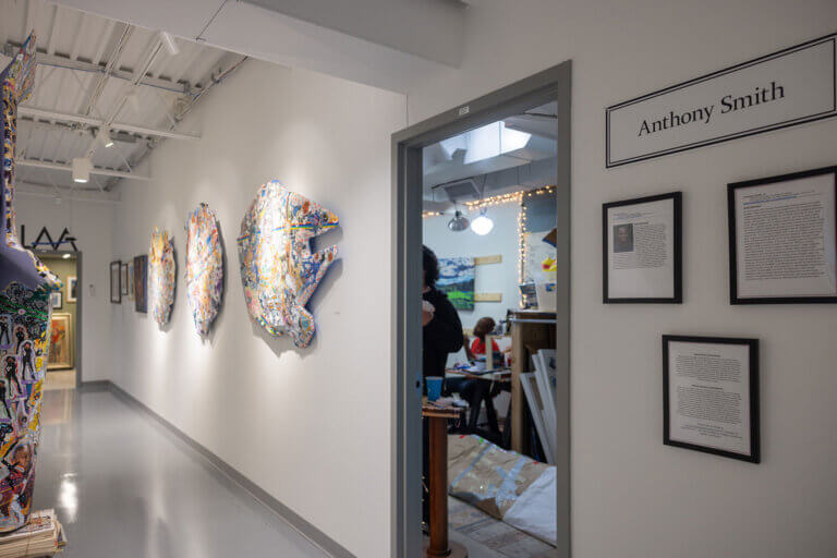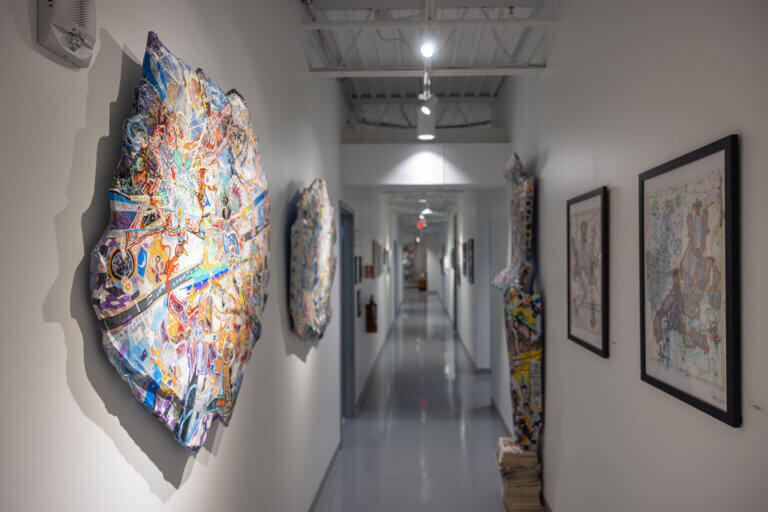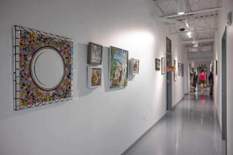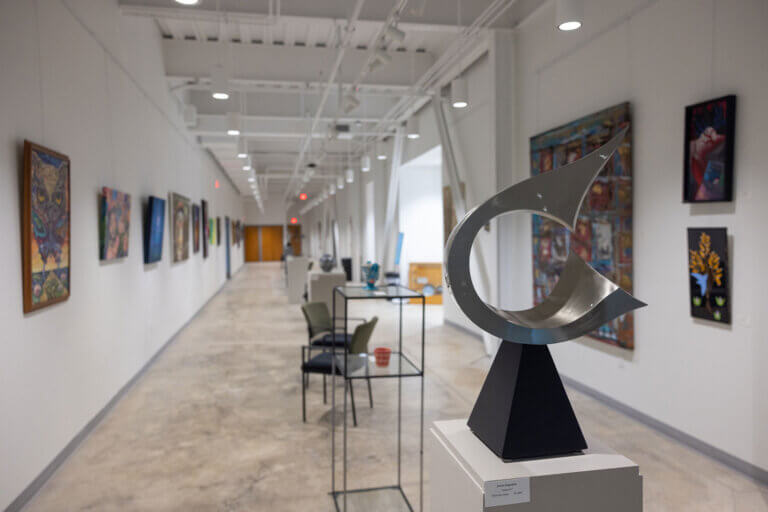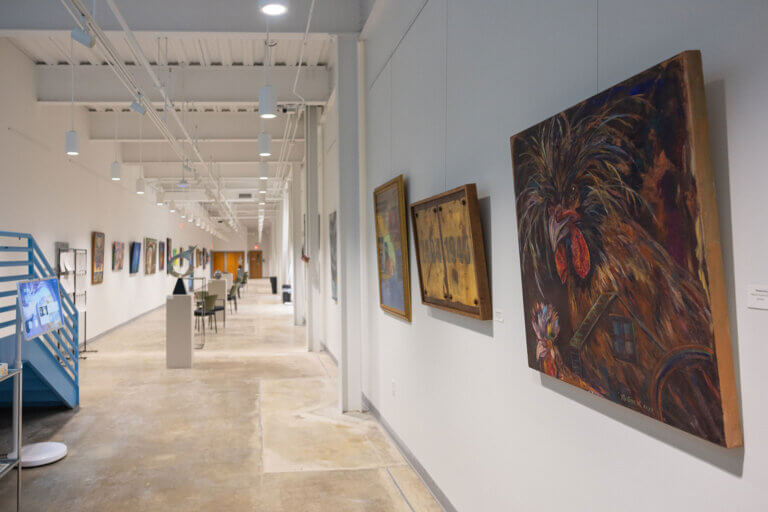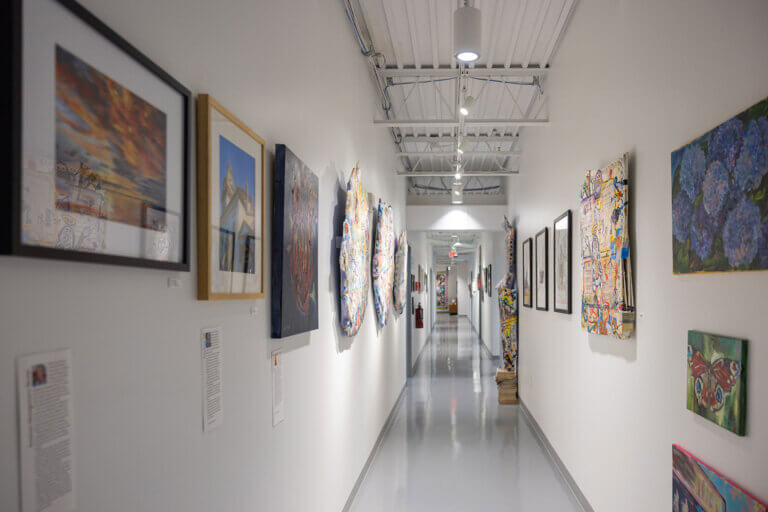 From a design aspect, the existing space certainly held its challenges. The building sits over a culvert which required investigation for locating new under-slab utilities and the elevator shaft. From the second-floor story space was very shallow from the floor to the bottom of the structure which posed some challenges with ceiling heights. Ultimately it was decided to expose some of the structure throughout studios along the exterior wall, the corridors, and the main gallery space. The second-floor studios located internally in the building, have a ceiling in which the design team needed to adjust ductwork dimensions in order to achieve the highest ceiling possible.