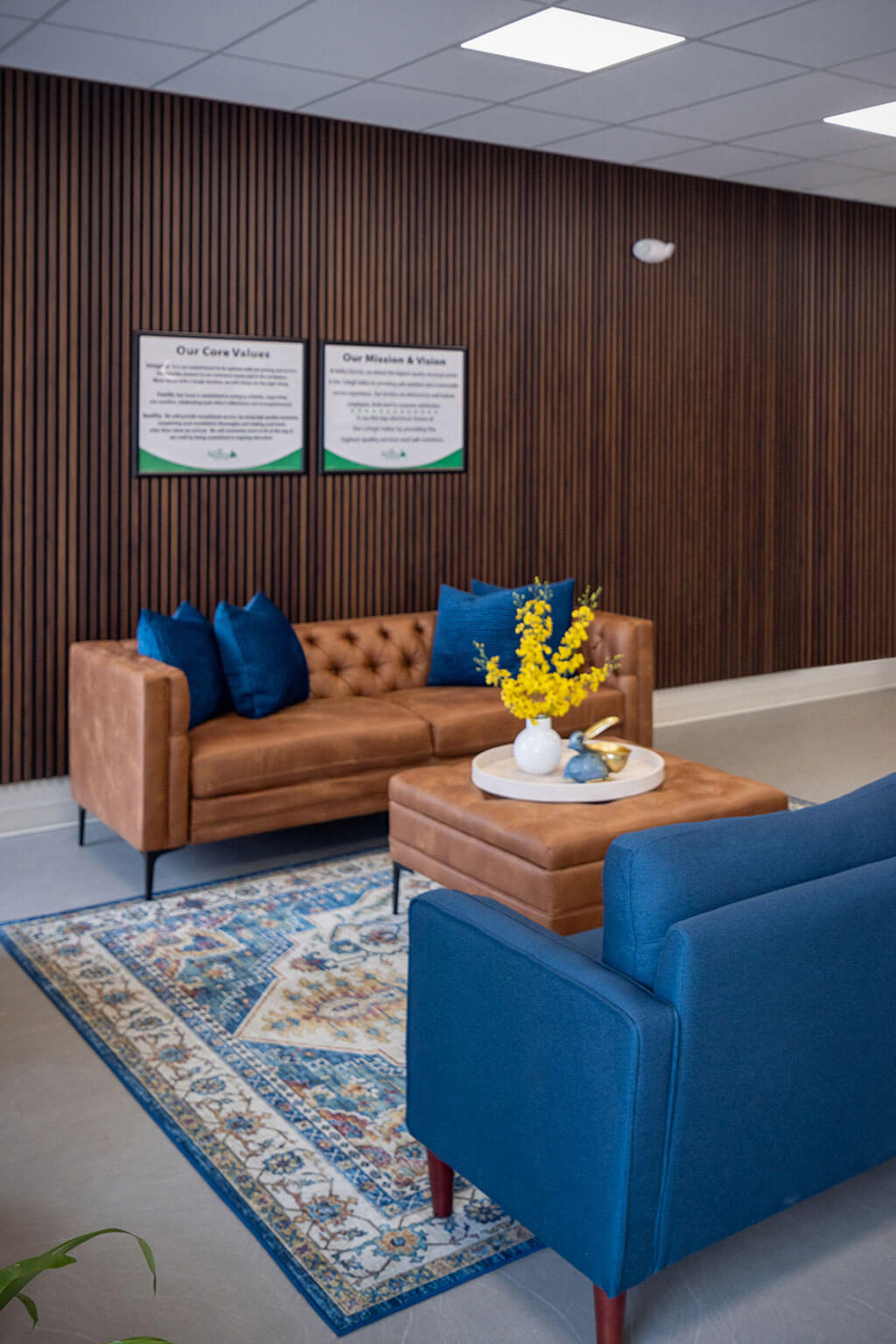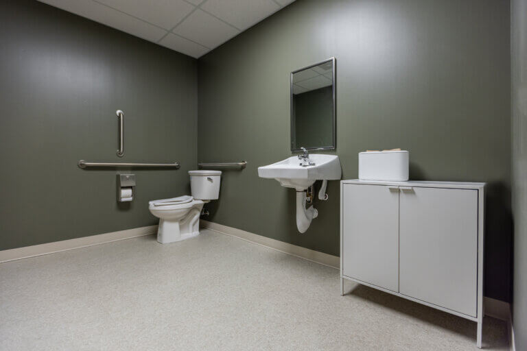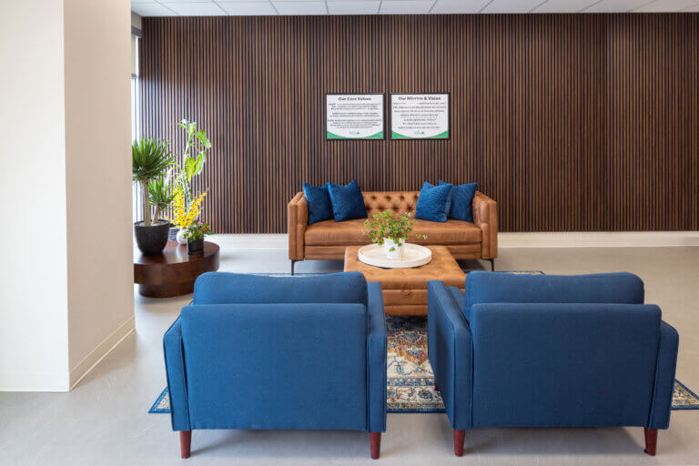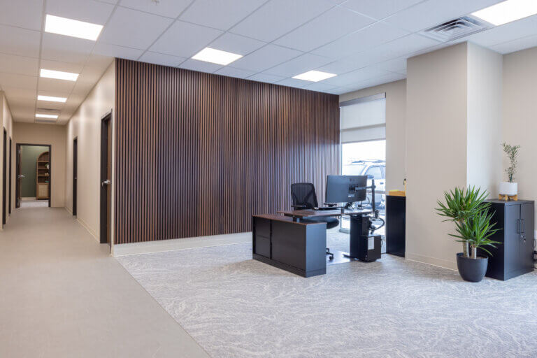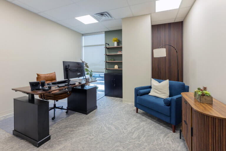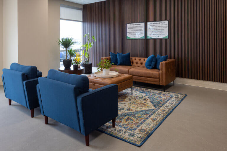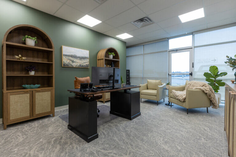 Bridget envisioned an environment that felt homey, comfortable, and welcoming. The interior finish concept incorporates nature-inspired patterns and a soft creamy color palette, accented with pops of deep green. Branding was thoughtfully curated throughout the space, without directly reflecting brand colors, resulting in a comfortable timeless aesthetic.