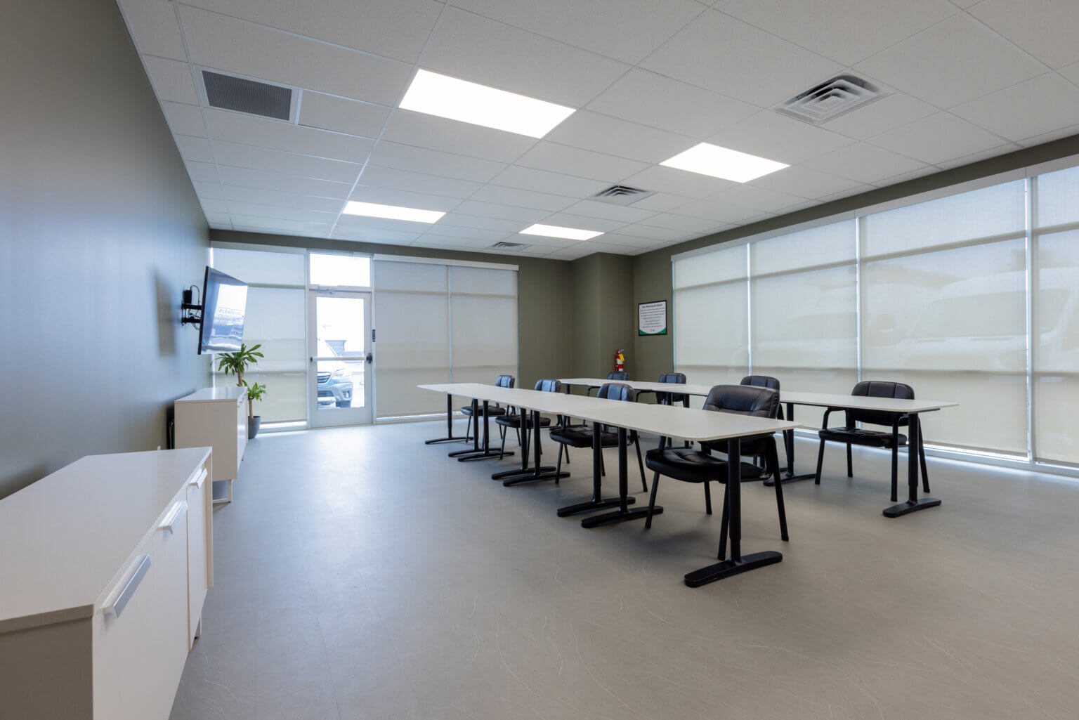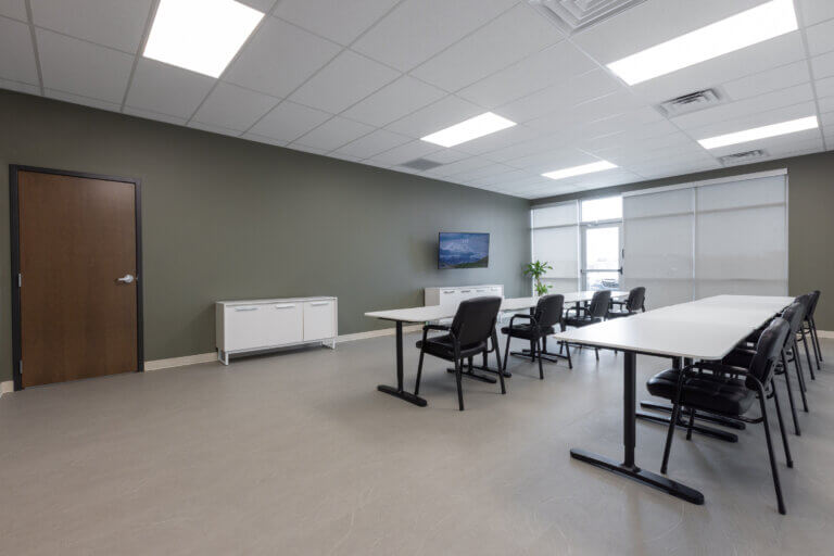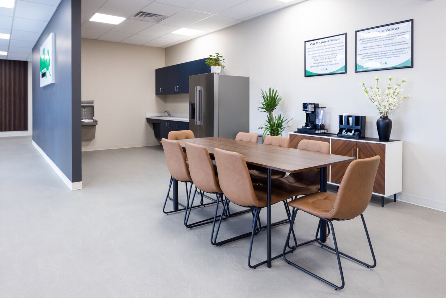 The fit-out features a welcoming open office adjacent to a comfortable soft-seating area that encourages informal collaboration. Additional amenities include a kitchenette and open staff dining area, three private offices, and new toilet rooms designed for staff and visitor convenience. A dedicated training room was created as an essential component to support Kelley Electric’s commitment to training and team support. This space is directly adjacent to warehouse storage space, which was upgraded with new wall paint and durable resinous flooring to create a clean and functional workspace.