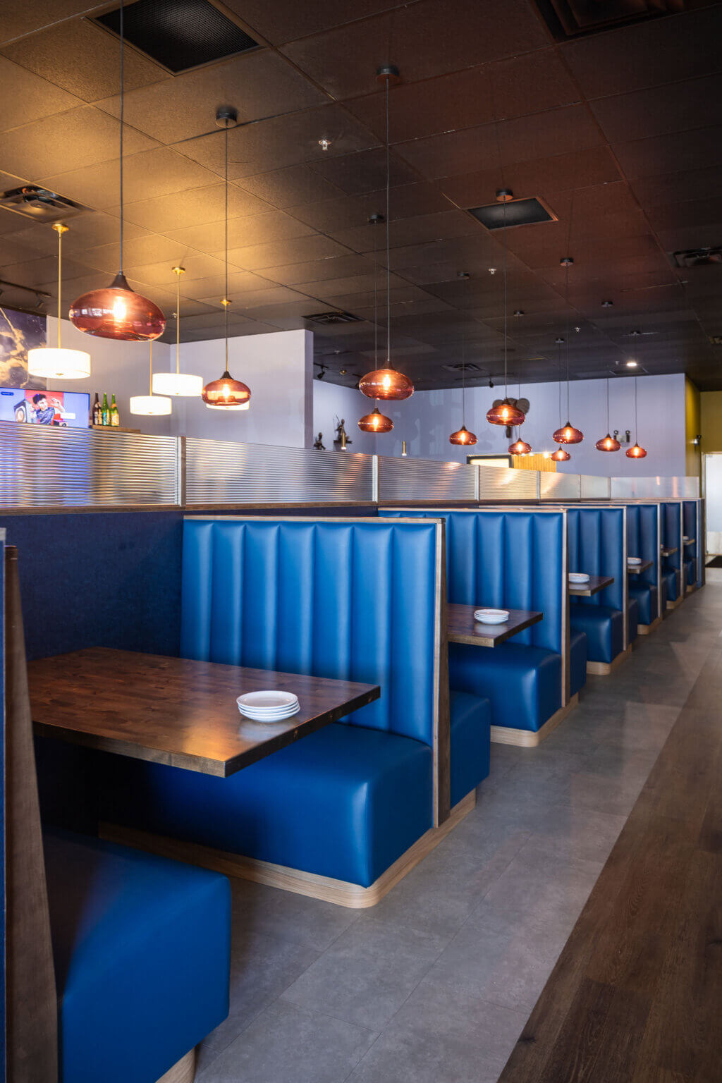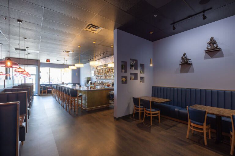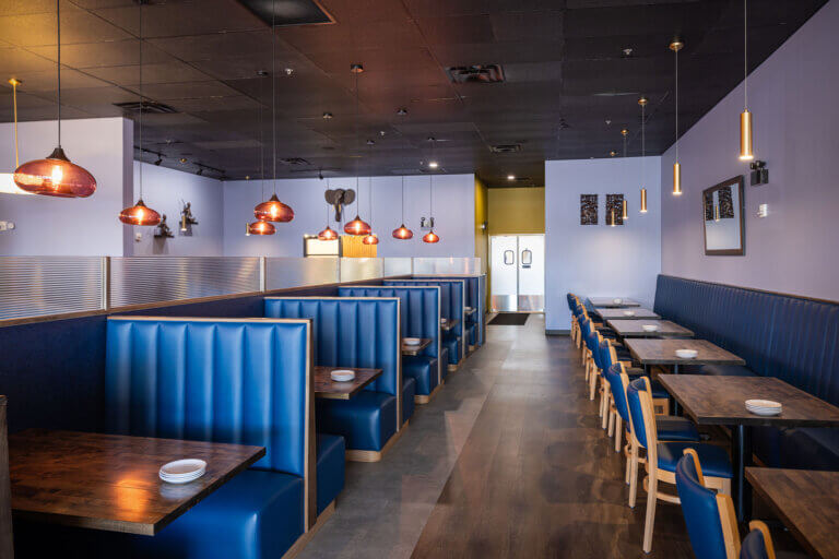 The completed Little Orchids restaurant now features a modern commercial kitchen, a custom‑built bar, inviting booth seating, decorative lighting, artistic focal points, and a cohesive interior that reflects the design intent established early in the project. The finished environment transforms the former kickboxing studio into a warm, memorable dining destination that supports the Nirojanapa family’s continued growth in the region.