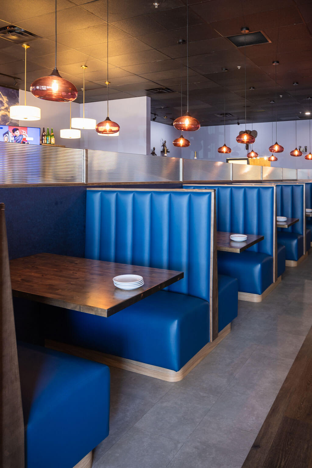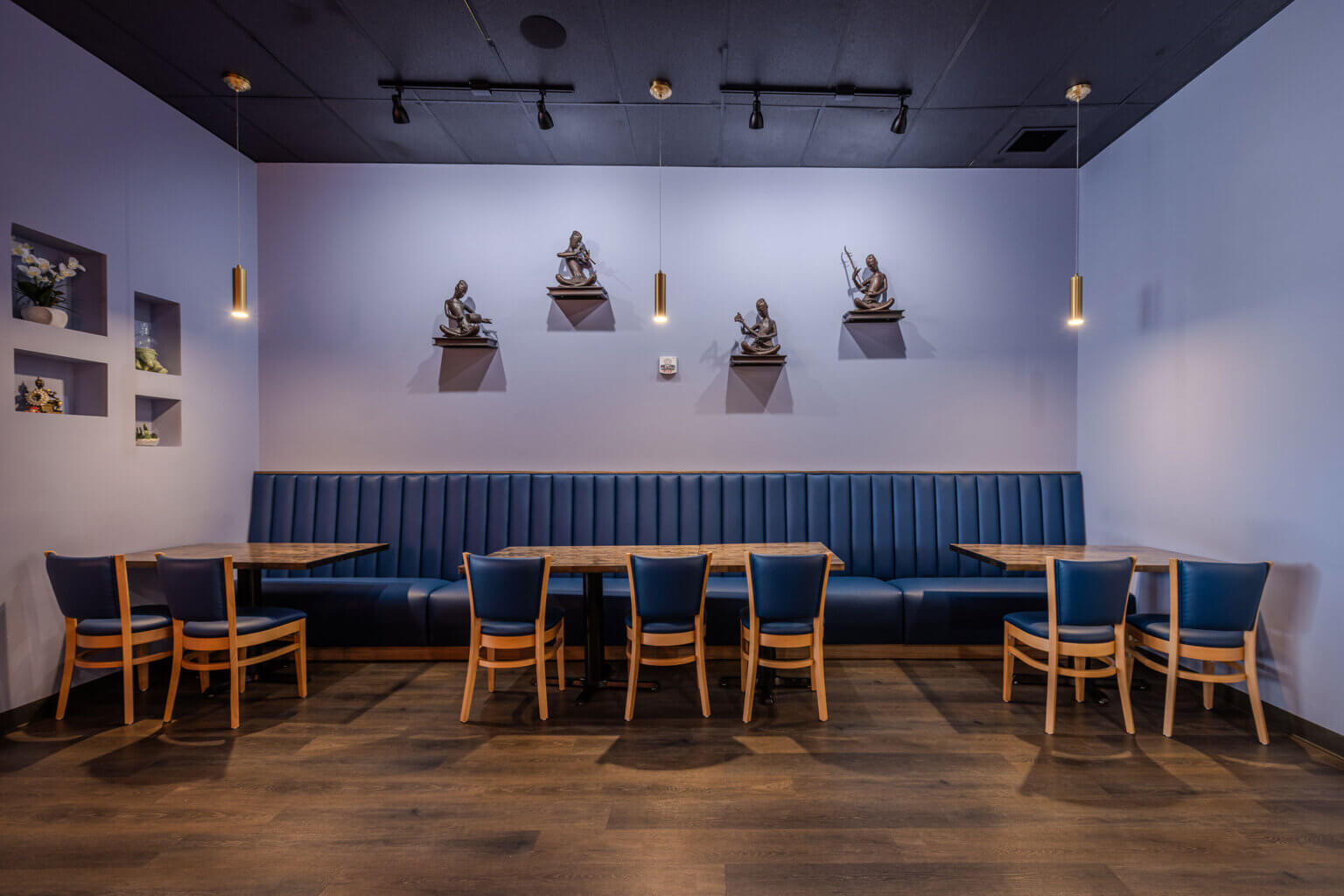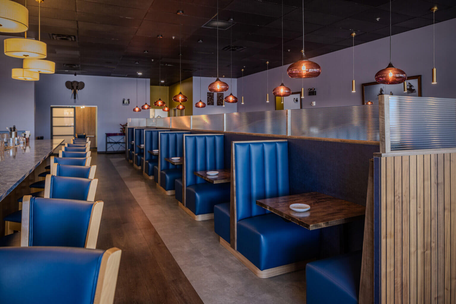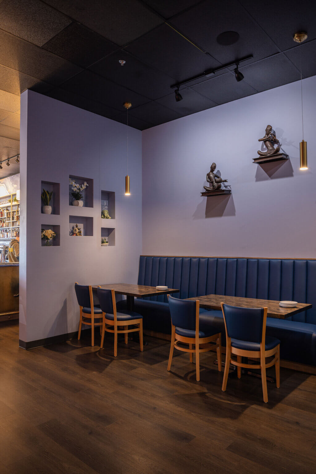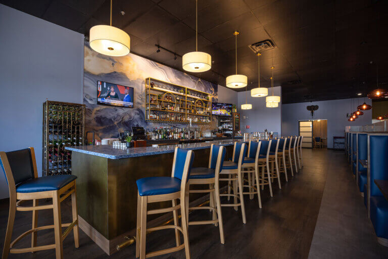 Vendor coordination played a meaningful role in shaping the final interior. SAGE worked with the furniture vendor to confirm dimensions, layouts, and finish selections for the banquette seating and additional custom pieces. The same level of involvement applied to the bar design, where SAGE supported the vendor by validating sizing and recommending finishes. Additional design contributions included decorative lighting selections, the introduction of a custom wall mural, and the design of recessed niches sized specifically to house 3D artwork. While the project did not include exterior construction, SAGE coordinated with the sign vendor to ensure branding was properly integrated at the building’s façade.